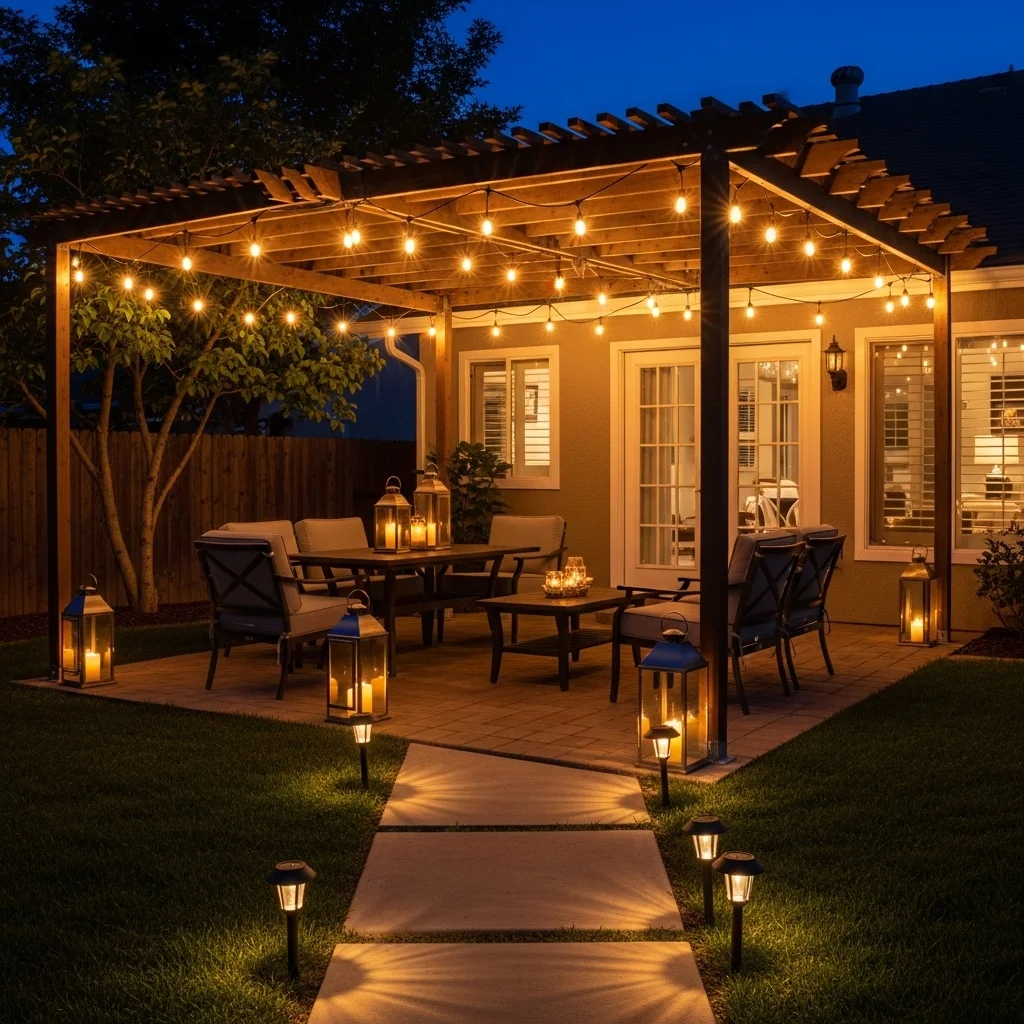 String lights are not in because they are not popular. Cafe-style bulbs are the ones that I hung in our pergola in a zigzag form, and that warm light changes the whole area as soon as the sun goes down. But I didn’t stop there. Tables with lanterns of different heights will have depth and I alternate battery-operated candles (to be safe and convenient) and real candles when we are out there and doing active activities using the space.