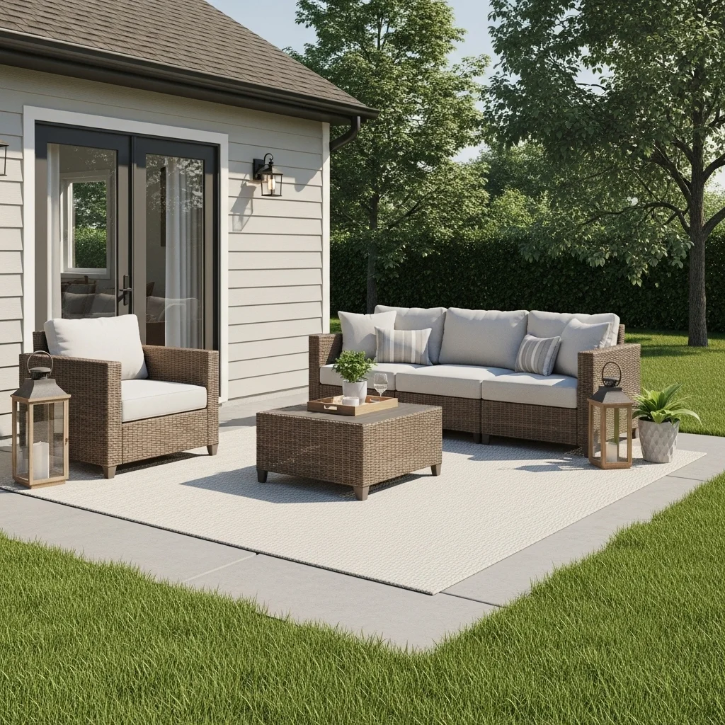 Everything was transformed as a result of an outdoor rug. A weather-neverwhere rug that is placed even when inside working on concrete or on a wooden deck renders an immediate room ambience. I picked a standard, unpatterned, geometrical allusion which aids in disguising dirt, surprisingly well–a fact which someone ought to have told me before I became in love with that cream-coloured loveliness at the home shop.